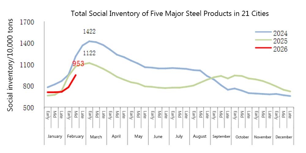 CISA reported that in mid-February, social steel inventory reached 9.53 million tons, up 22% month-on-month.