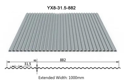 YX8-31.5-882 Color-Coated Profiled Sheet, also known as YX8-31.5-882 Color-Coated Corrugated Roofing Sheet, YX8-31.5-882 Small Corrugated Tile, YX8-31.5-882 Small Corrugated Panel, is a profiled steel sheet with an extremely low wave height. The wave crest height is only 8mm, featuring 28 wave profiles. The wave crest spacing is just 31.5mm, with a cover width of 882mm and an extended width of 1000mm.