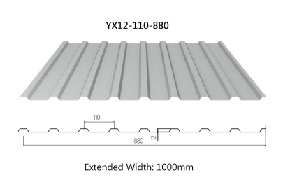 YX12-110-880 Color-Coated Steel Profiled Sheet, also known as YX12-110-880 Color-Coated Steel Sheet, YX12-110-880 Color Steel Roofing Tile, features a 12mm rib height, composed of 8 waves with an 110mm wave pitch, a cover width of 880mm, and an extended width of 1000mm. Suitable for walls or construction fencing, standard colors include sea blue, crimson, and white-gray, with custom colors available upon request.