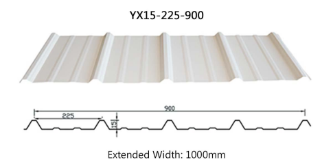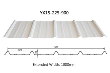 YX15-225-900 color-coated steel sheet, also known as YX15-225-900 color-coated steel tile, YX15-225-900 color-coated profiled sheet, YX15-225-900 profiled steel sheet, etc. It is manufactured by cold-rolling 1000mm-wide color-coated galvanized steel sheets into various wave profiles. The cover width is 900mm, with an extended width of 1000mm. It features lightweight construction, high strength, rich color options, quick and easy installation, earthquake resistance, fire resistance, waterproofing, long service life, and low maintenance requirements.