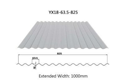 YX18-63.5-825 Color-Coated Corrugated Steel Sheet is a profiled sheet manufactured by cold-rolling and bending color-coated steel plate into various wave patterns. It is widely used in steel structure enclosures. The wave height is 18mm, wave length is 63.5mm, cover width is 825mm, and extended width is 1000mm.