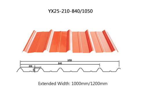 YX25-210-840 color steel roofing panels are specialized color steel sheets for roofing and wall cladding, featuring high strength and rapid installation. With a wave height of 25mm, they consist of 5 waves spaced 210mm apart, providing an effective coverage area of 840mm. The extended width is 1000mm.