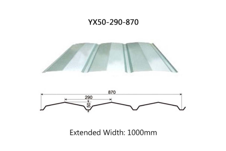 Wave height 50mm, wave length 290mm, cover width 870mm, extended width 1000mm, thickness 0.3-0.6mm. Specifically designed for large-span steel structure roofs such as airport terminals or sports stadiums, where the high wave height and wide wave spacing effectively distribute loads.