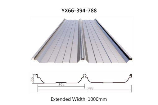 YX66-394-788 Roof Panel with 360-degree interlocking profile, providing reliable sealing to prevent leaks. Sliding bearings enable perfect thermal expansion and contraction compensation. Concealed, self-locking edges deliver outstanding wind resistance and waterproofing capabilities. Wave height: 66mm,wave length: 394mm,cover width: 788mm,extended width: 1000mm