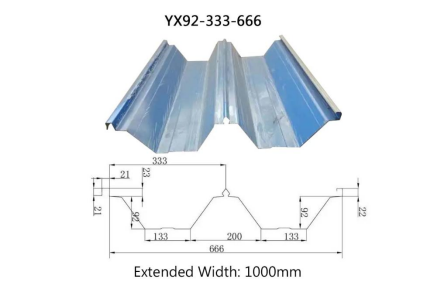 With a wave height of 92mm, wave length of 333mm, and effective coverage width of 666mm, this profile is cold-formed from color-coated steel sheets with an extended width of 1000mm. Designed specifically for high-load industrial roofing applications.