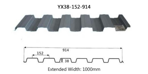 YX38-152-914 color steel sheet, also known as YX38-152-914 profiled steel sheet, is roll-formed from aluminized-zinc steel sheet, galvanized steel sheet, or color-coated steel sheet with an unrolled width of 1250mm. It features a wave height of 38mm and a wave length of 152mm. with a total panel width of 914mm. The panel pattern utilization rate is 73%. It offers excellent bending resistance, load-bearing capacity, and seismic performance, making it suitable for various building structures such as industrial plants, warehouses, and garages.