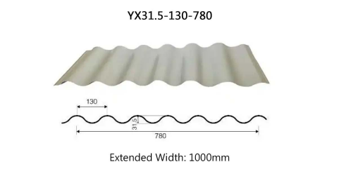 Wave height: 31.5mm, Wave Length: 130mm, Cover width: 780mm, Extended width: 1000mm, Thickness: 0.3-0.6mm. Suitable for lightweight roofing systems such as small warehouses or temporary structures. The increased corrugation height enhances structural rigidity.