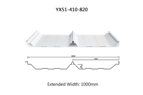 YX51-410-820 is a concealed metal roof panel featuring a 180-degree interlocking seam connection. This profiled sheet is a standing seam roof panel characterized by high wave peaks and exceptional strength. It allows for arching, has no exposed screws on the surface, and offers outstanding waterproofing performance.