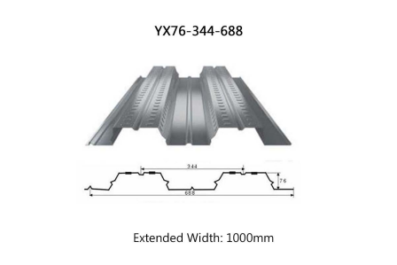YX76-344-688 open-end floor decking features a wave height of 76mm, wave spacing of 344mm, and an effective coverage area of 688mm per meter. Manufactured from 1000mm hot-dip galvanized steel plate through cold-forming, it offers high load-bearing capacity and excellent fire resistance.
