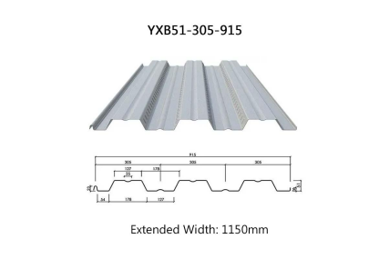 The YXB51-305-915 open-profile steel sheet has a cross-sectional height of 51mm, consisting of 3 waves with a wave spacing of 305mm each. Its effective utilization width is 915mm (excluding overlap width). This profile is cold-formed from 1150mm-wide cold-rolled hot-dip galvanized steel sheet via roll forming, achieving a material utilization rate of 79.56%.