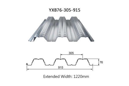 The rib height of the YXB76-305-915 profiled steel sheet is 76mm, consisting of 3 waves with a wave spacing of 305mm each. The effective width of the entire profiled steel sheet is 915mm. YXB76-305-915 is a standard profile type in building profiled steel sheet specifications, with an unfolded width of 1220mm and a utilization rate of 76%.