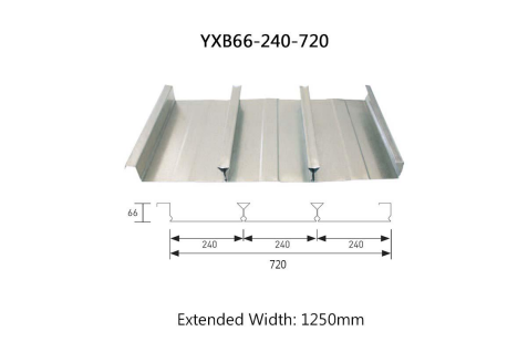This is a cost-effective, versatile closed-end panel profile. It features a wave height of 66mm and a wave length of 240mm. The cover width is 720mm. Comprising three waves, its generous width reduces the number of panels required, enhancing construction efficiency. The extended width is typically 1250mm, achieving a utilization rate of 57.6%–59%, resulting in relatively economical steel consumption. Beyond the common advantages of closed-end plates—such as strong concrete bond and a flat underside—its structural parameters like sectional moment of inertia and sectional resistance moment are clearly defined, facilitating selection in engineering design.