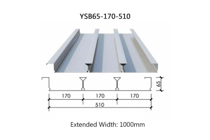 The YXB65-170-510 closed-end floor decking features a wave height of 65mm, composed of three waves spaced 170mm apart. After forming, the cover width of the entire panel is 510mm (excluding overlap width). It is manufactured by cold-rolling and roll-forming 1000mm-wide cold-rolled hot-dip galvanized steel sheet. With a material utilization rate of 51%, it is one of the most mature and frequently used floor decking profiles.