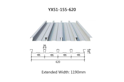 The YX51-155-620 floor decking panel, also known as the YX51-155-620 dovetail floor decking panel, is manufactured by mechanically rolling galvanized cold-rolled steel sheets with an input width of 1190mm. Note that this input width is not a standard width readily available on the market, such as: (1000mm, 1200mm, 1250mm, etc.). It requires special customization at 1190mm width. This profile features 4 wave pitches, with clean, burr-free cut edges and a material utilization rate of approximately 52.1%. It represents a typical example of second-generation floor decking.